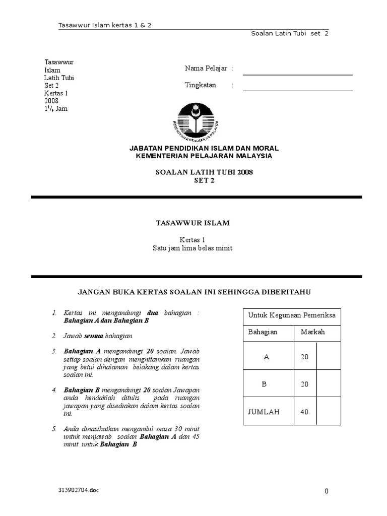 Tasawwur islam latih tubi set 2 kertas 1 2008 114 jam. Kertas Soalan Peperiksaan Sebenar SPM Tasawwur Islam 2015-2019. Koleksi Kertas Soalan Peperiksaan Percubaan Tasawwur Islam SPM 2021 2020 2019 2018 Skema Jawapan.